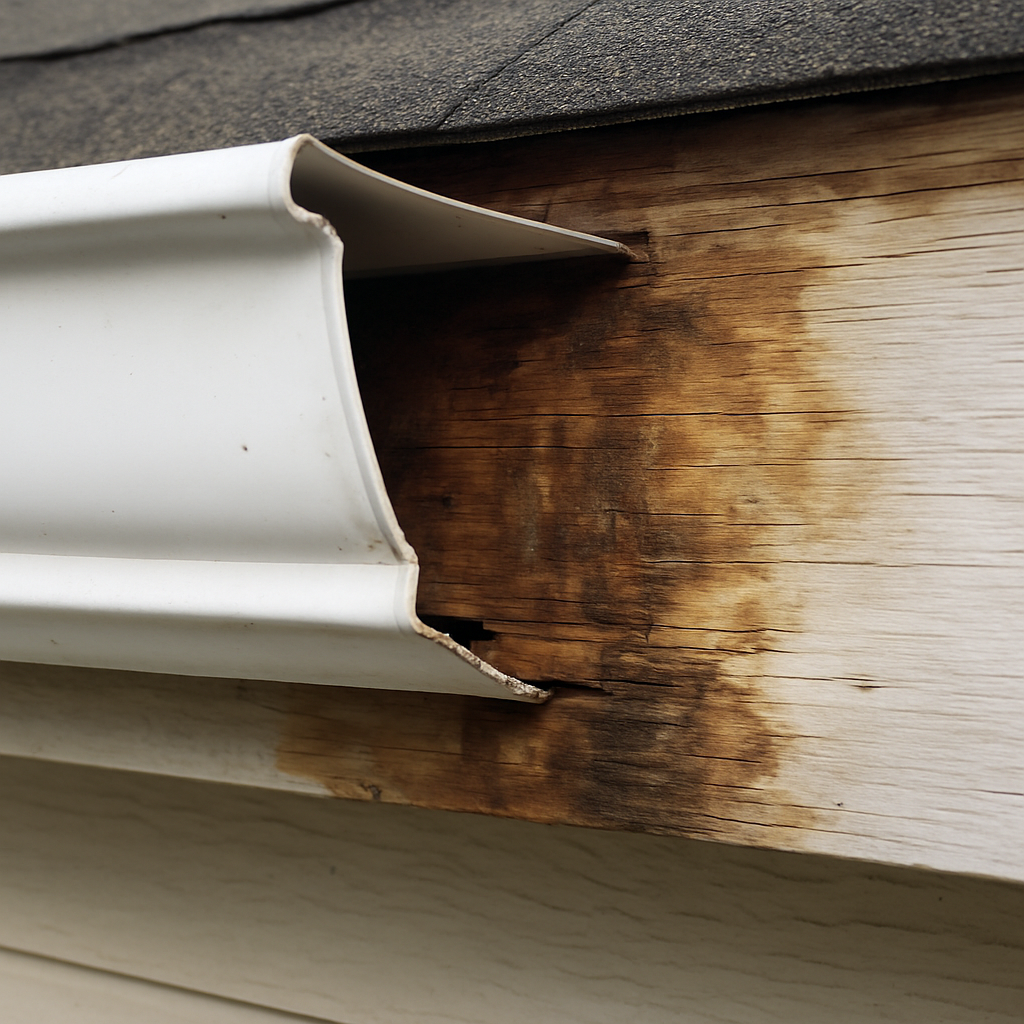 When your gutter acts like a saturated sponge pressed against the fascia day after day, it creates the perfect environment for wood rot. The paint begins to peel, the wood softens to the consistency of wet cardboard, and its ability to hold heavy gutter fasteners is destroyed. These dark stains and warped boards are clear signs of roof damage from blocked gutters.